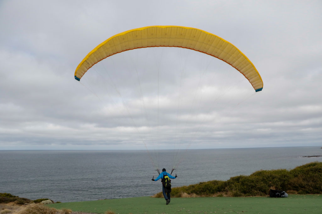 Die Bedingungen waren gut zum Soaren am Lookout, aber mit Windrichtung Südost für den Flug zum Leuchtturm knifflig. Schlussendlich war es eine Mischung aus Fliegen und Groundhandling. 🙂